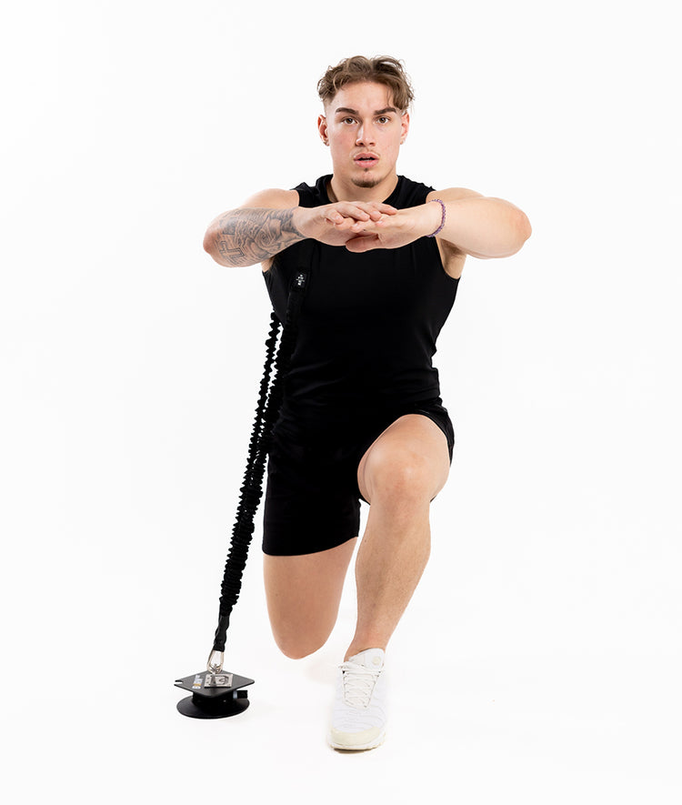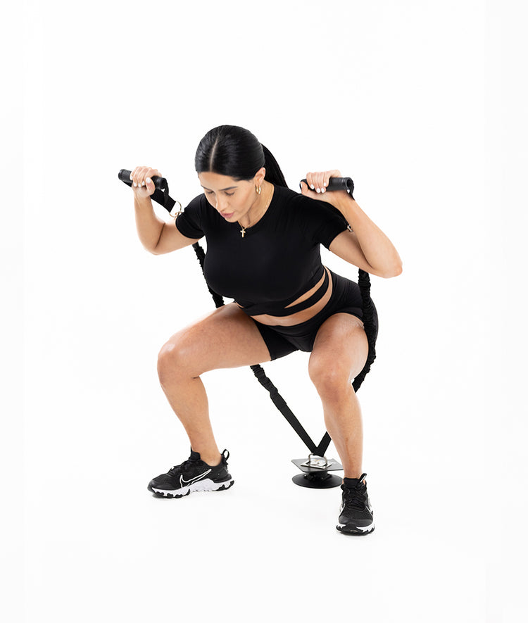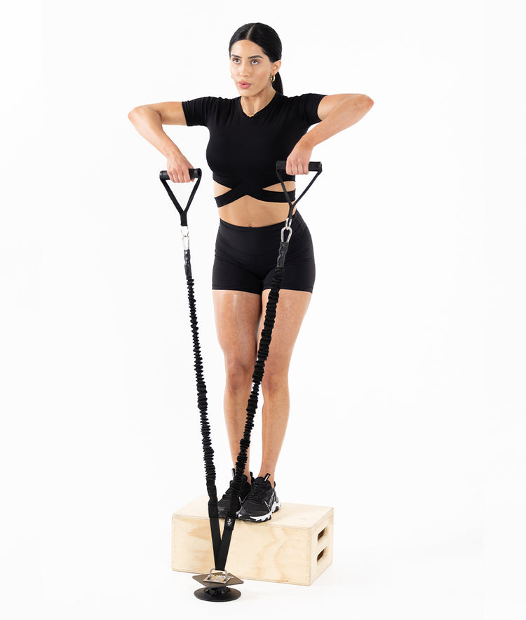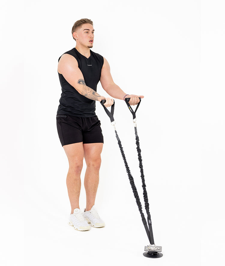 Stand straight and hold onto hand grips, with arms up like you're guarding a punch. Walk back until you feel a slight tension with the bands. Squeeze glutes and let the fists fall forward while keeping elbows stationary. Bring the fists back up to the forehead.