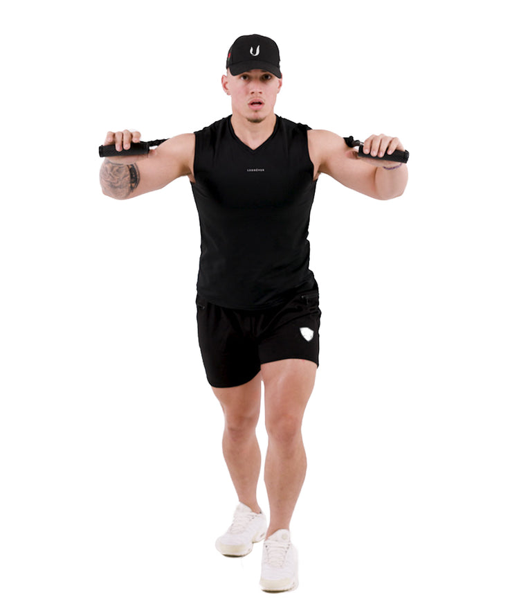 Stand straight with feet hip-width apart and toes forward. Squeeze your glutes and pull your hands up to the beside while keeping your elbows slightly bent. Slowly lower your hands back down to starting position.
