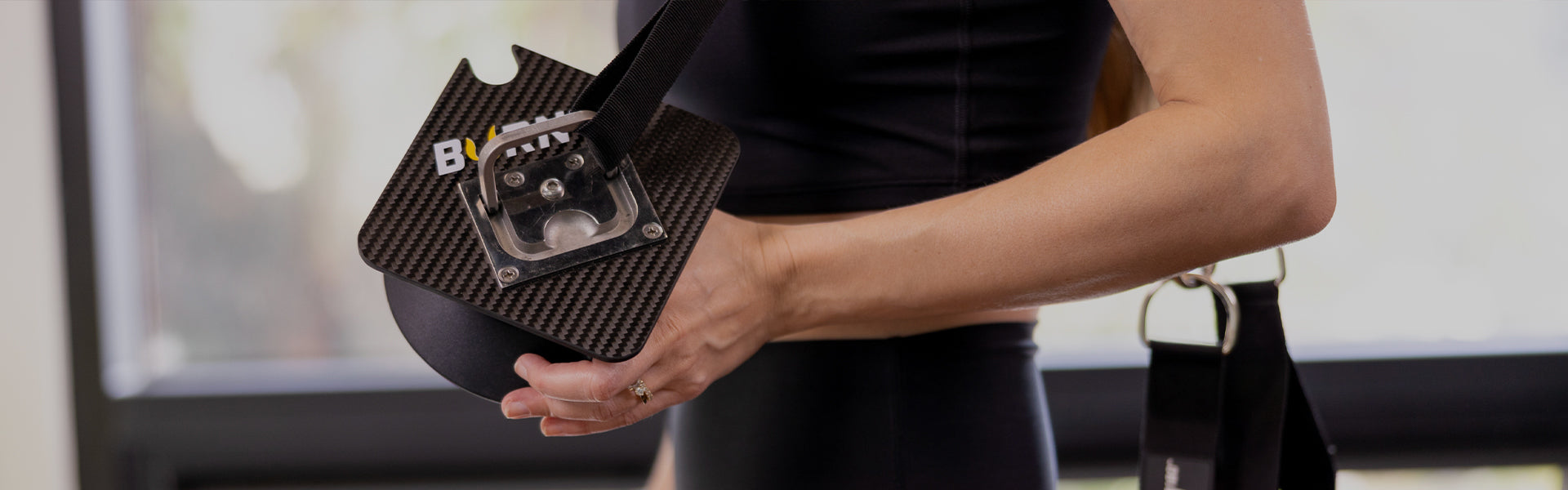 Attach your BURN180 resistance bands to the stainless-steel latch connected to the black mounting plate. Utilize the heavy-duty carabiner to attach securely to the latch.