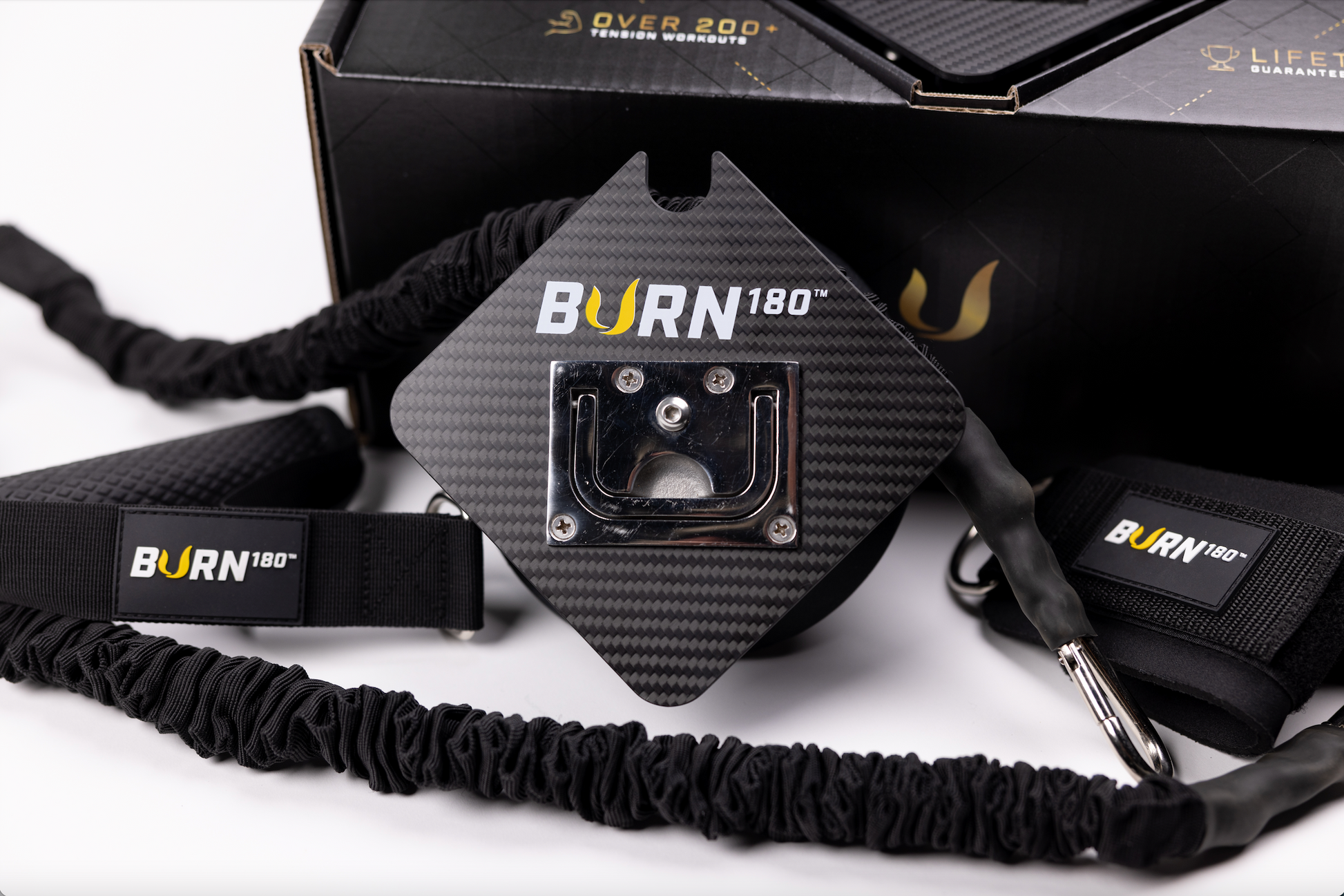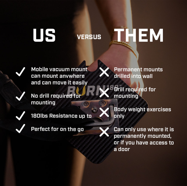 The BURN180 system is all centered around our mobile, patent-pending vacuum mount. Position your BURN180 vacuum mount on any flat, non porous surface and target specific muscle groups depending on where you mount your unit. The BURN180 system allows you to adjust weight resistance in seconds from 25lb up to 130lb of resistance (can be used up to 180lb maximum resistance load). You are not restricted to just your own body weight like other training systems. Mounts securely in seconds and can be removed in seconds. Minimal size and weight provides a perfect workout companion when traveling.